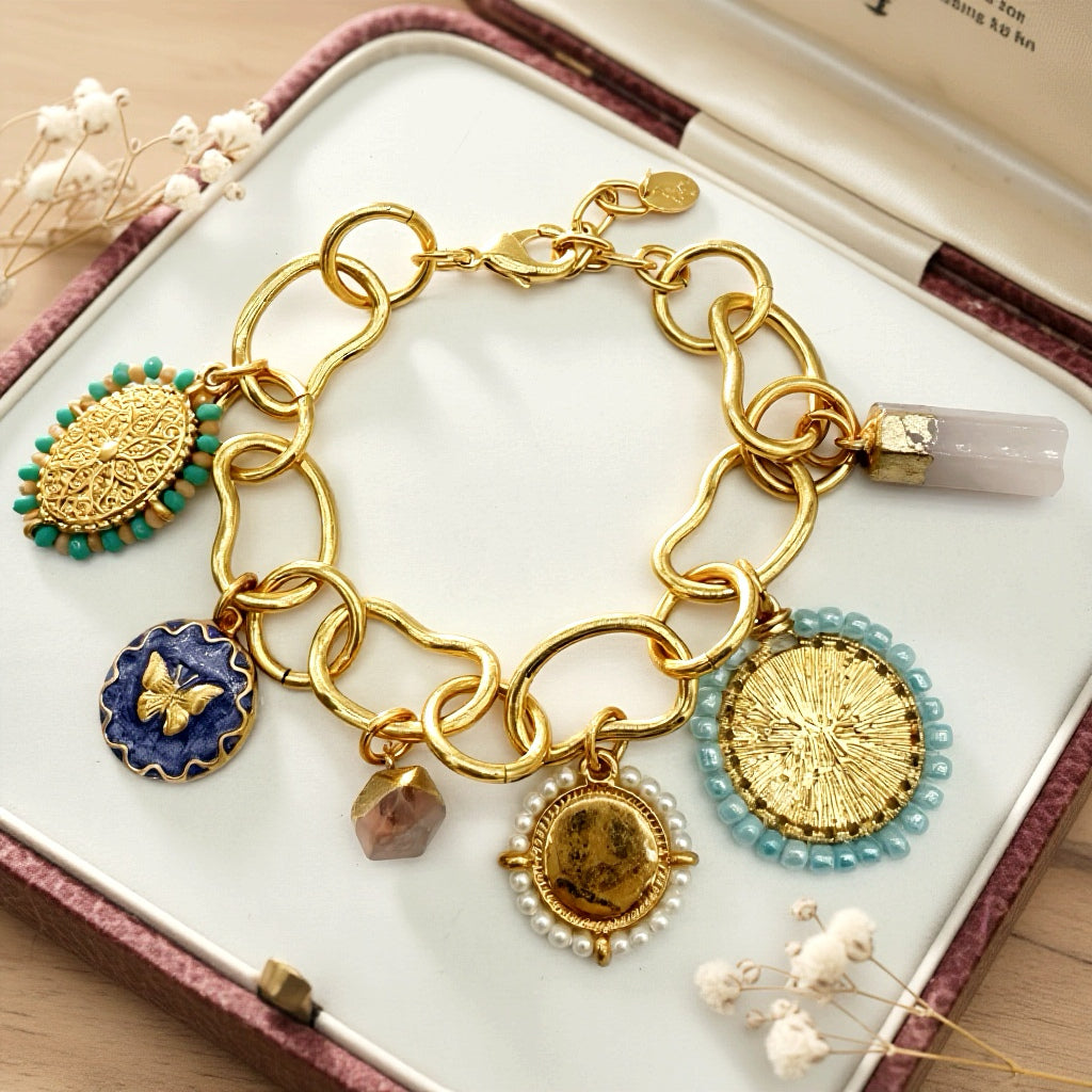 Antique-Gilt Hammered Links · Relief Medallions × Enamel Charms Bracelet
