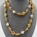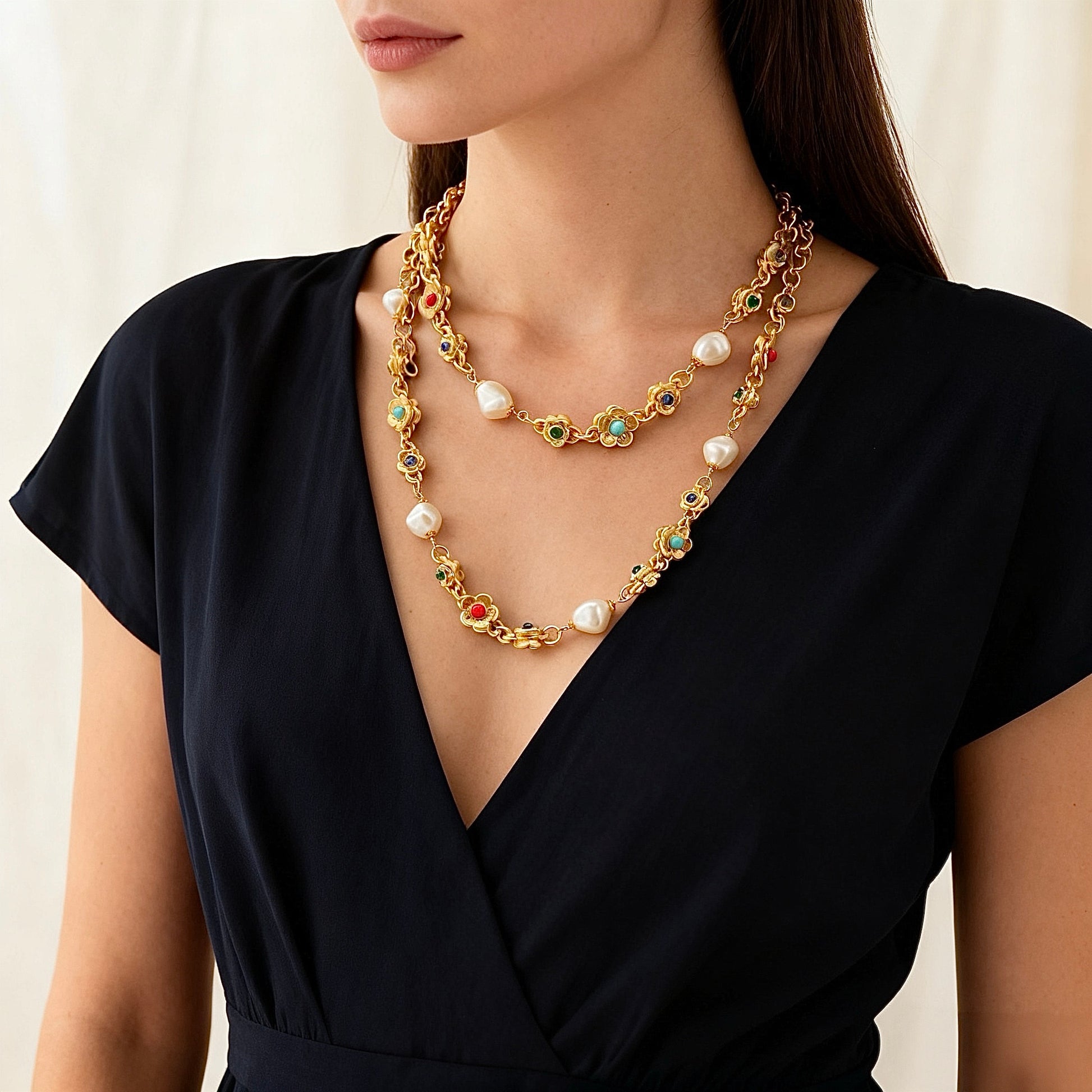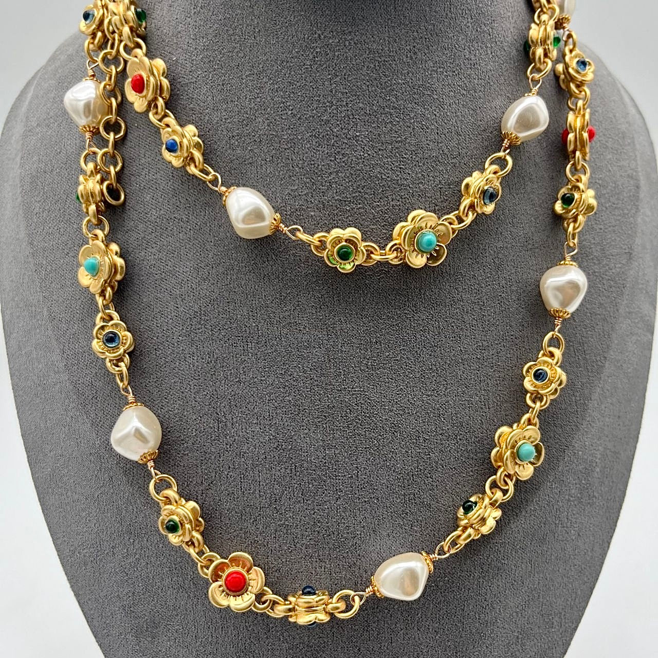Alternating colorful enamel flowers and lustrous pearls, making for an eye-catching piece.