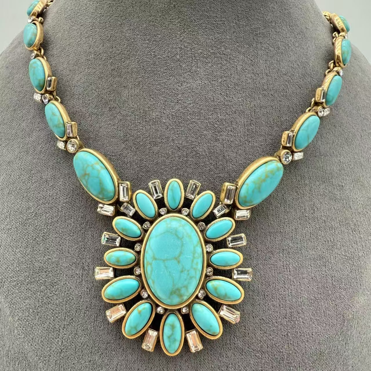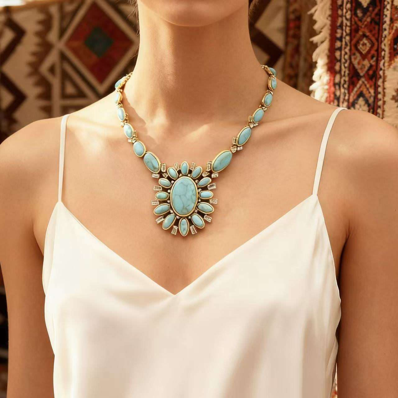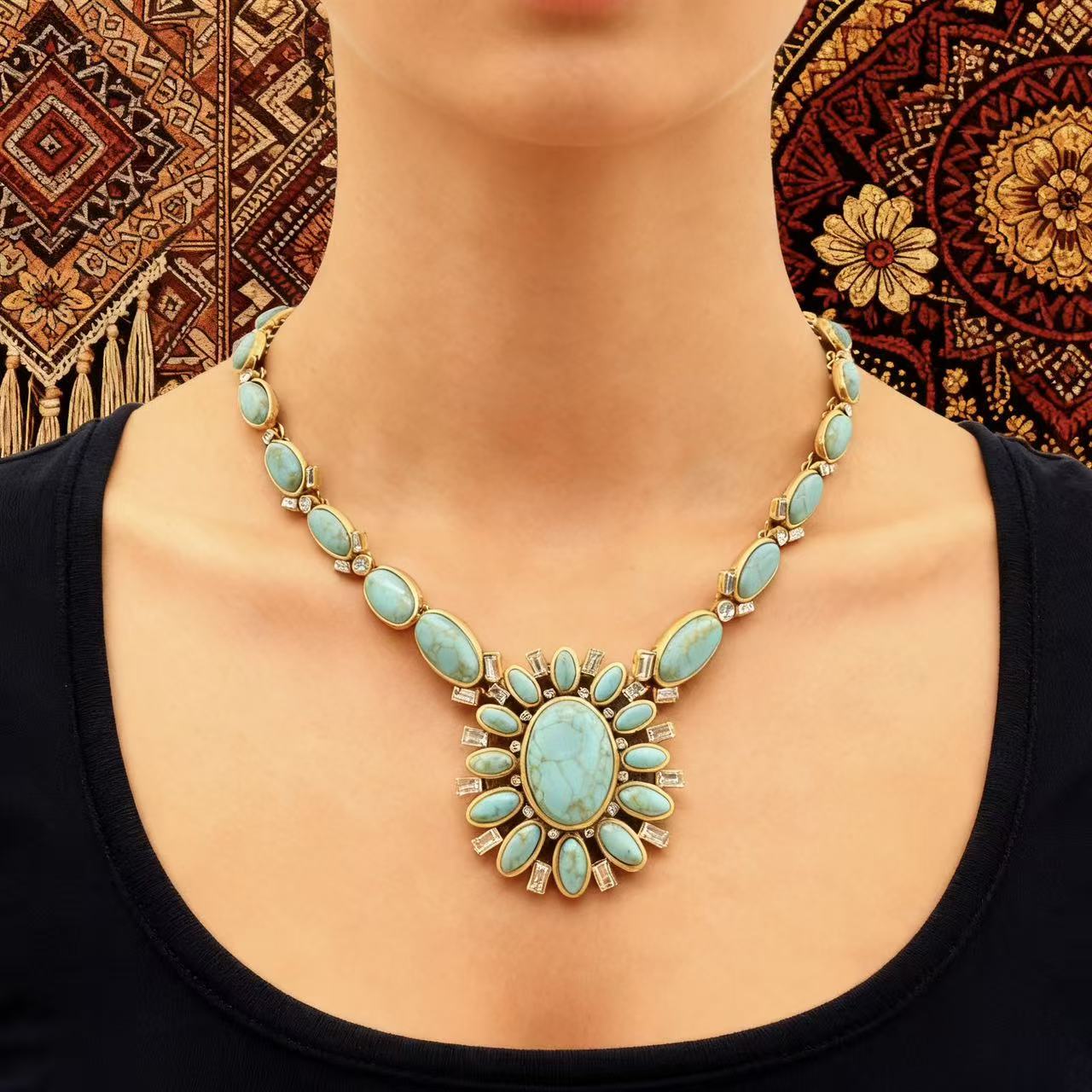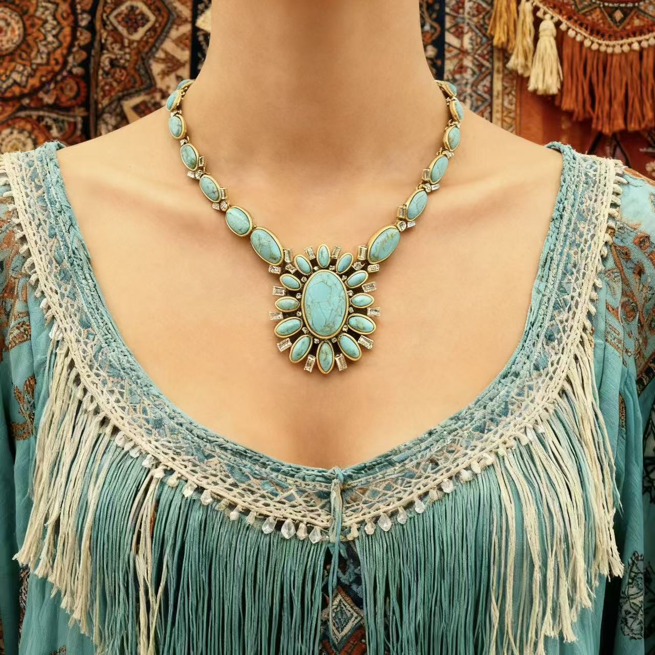 A bold oval turquoise center with a sunburst layout for instant vintage appeal.